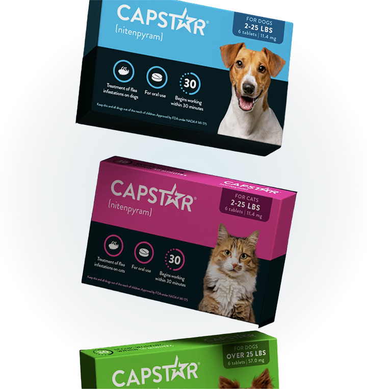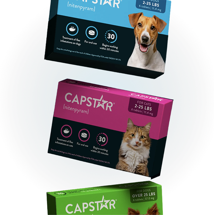 CAPSTAR® (nitenpyram) are fast, effective, and available over-the-counter without a prescription. CAPSTAR oral tablets work from the inside out, killing adult fleas in just 30 minutes with one dose and is safe to administer daily as new fleas appear. Don’t wait for adult fleas to spread. Stop the itch. Give your pet CAPSTAR for fast flea relief today.